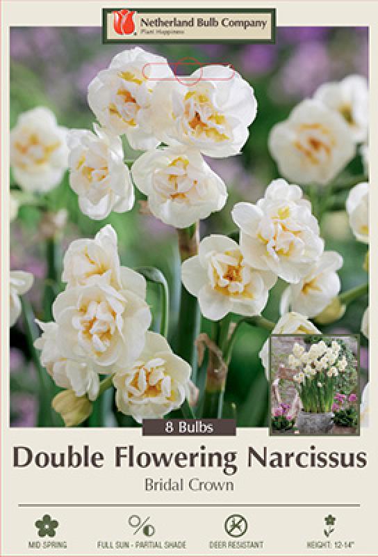 Winner of multiple awards, this new double daff creates quite a sensation in mid-spring gardens. Velvety blooms in a creamy shade of white show off yellow centers and a lush flower form. Bridal Crown also delivers a strong fragrance to both outdoor plantings and indoor arrangements. A unique and interesting variety, it multiplies quickly and naturalizes readily, providing years of increasing beauty.