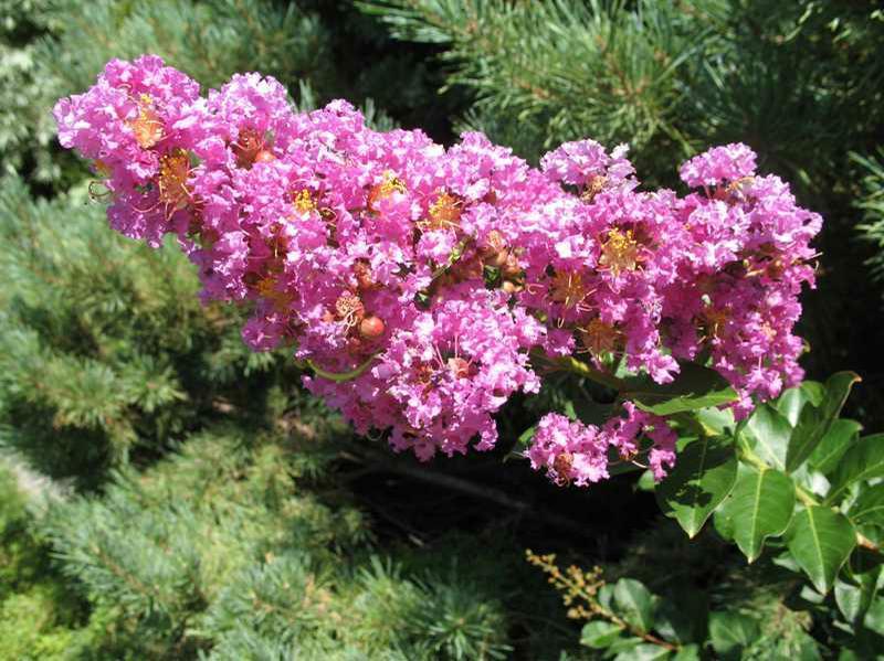Zuni is a deciduous, upright, spreading, multi-stemmed shrub. 'Zuni' is a compact cultivar which features dark green foliage turning dull red to reddish purple in fall, grayish-brown bark which exfoliates with age and terminal, crepe-papery, 3-5" long inflorescences (panicles) of lavender flowers from mid-summer to early fall. Flowers give way to round seed capsules which often persist well into winter. In the South, this cultivar can easily be grown as a woody shrub with a maximum size of 11' tall and 10' wide. In the St. Louis area where winter injury is a problem, plants will grow much smaller.