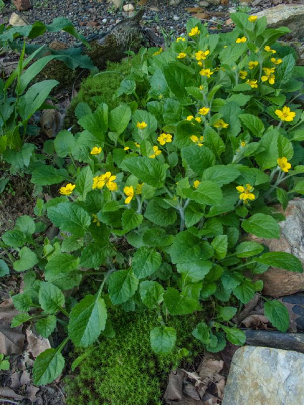 A showy plant with yellow, daisy-like flower heads on very hairy stems. Green-and-Gold is a perennial herb with opposite, oval, hairy leaves and clusters of star-shaped yellow flowers blooming for long periods atop the tight clump of foliage. It is a highly variable species: the northern variety is taller and more upright; the southern one prostrate and creeping.