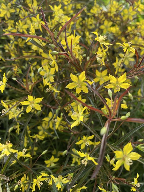 The wine red foliage of Lysimachia slowly creeps in the garden and grows 1'-2’ tall with an equal spread. Throughout the summer, the diminutive flowers twinkle and bloom a bright yellow, contrasting with the maroon leaves. Lance-leaved loosestrife is a quiet plant, settling along garden borders and along hillsides and at the base of trees or shrubs. What we love about this plant is its sunny tough-as-nails attitude, heat tolerance, and how it steadily spreads by rhizomes, covering the ground and suppressing weeds while supporting pollinators and wildlife. It’s easy to grow, delightful all year round, and is the living embodiment of ‘green mulch’.