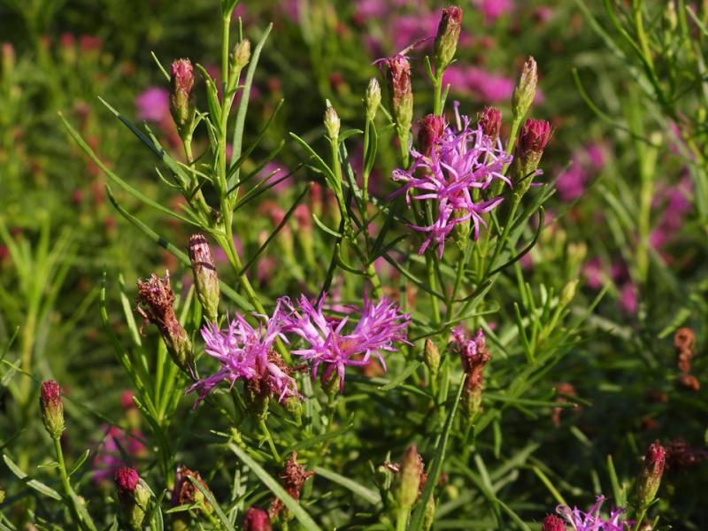 Vernonia lettermanii, commonly called ironweed or Letterman's ironweed, is an upright, clump-forming, herbaceous perennial native to rocky outcrops, floodplains, and river scours in west-central Arkansas and adjacent areas of Oklahoma. Plants can reach around 2' tall with an equal spread. The finely textured leaves are thin and narrow (up to 3" long and around ⅛" wide). Terminal corymbs (branched, flat-topped inflorescences) of bright purple flowers appear in mid to late summer. Highly attractive to hummingbirds, butterflies, and other pollinators.