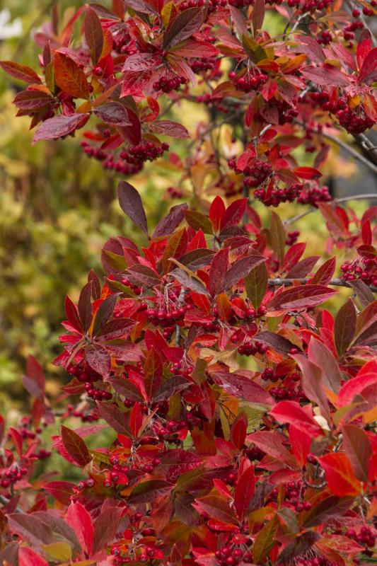 Improved, compact selection noted for its lovely white spring flowers followed by larger, more abundant glossy red fruit and brilliant red fall foliage. An easy-care, multi-stemmed shrub for massing in borders, woodlands and naturalized areas. Ideal near a pond or stream margin. Fruit is tart and bitter when eaten fresh, but may be used in preserves. Deciduous.