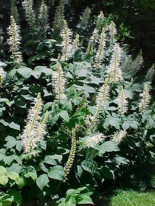 Aesculus parviflora. commonly called bottlebrush buckeye, is noted for being one of the best summer-flowering shrubs for shade areas. It is a dense, mounded, suckering, deciduous, multi-stemmed shrub which typically grows 6-12' tall. Features palmate green leaves (5-7 leaflets) and erect, showy, cylindrical panicles (to 12" long) of tubular white flowers with conspicuous red anthers and pinkish filaments. Mid-summer bloom can be spectacular. Flowers give way to glossy inedible, pear-shaped nuts (buckeyes) encased in husks, however these nuts are infrequently produced in cultivation in the northern parts of this shrub's growing range. Foliage turns yellow in autumn.
