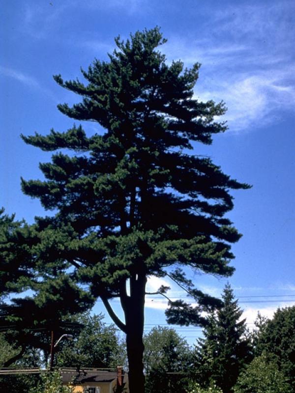 Eastern white pine is a large tree with a pyramidal crown when young, becoming flattened or broadly rounded with age.