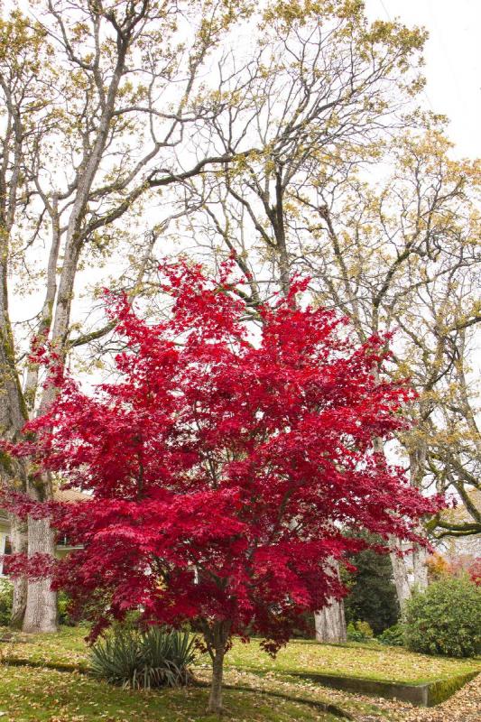 A graceful form with black-red bark veiled in dark red foliage that turns a brilliant scarlet in fall. Leaves bud out later in spring, better withstanding damage from late frosts than less cold hardy varieties. Displays most intense color in full sun exposure. Ideal as a colorful specimen in smaller landscapes. Deciduous.