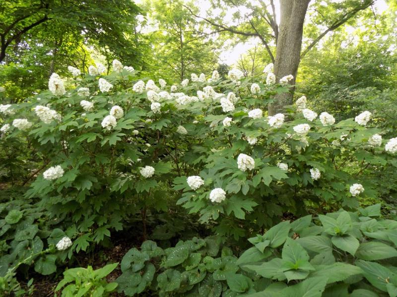 SNOW QUEEN has an upright broad, rounded habit and typically grows 4-6' tall. Features elongated, conical clusters (4-12" long) of mostly sterile, white flowers which slowly turn pinkish purple with age. Long late spring to summer bloom period. Distinctive, deeply lobed, somewhat coarse, oak-like, deep green leaves (to 8" long) turn attractive shades of bronze, maroon or purple in autumn. Mature stems exfoliate to reveal a rich brown inner bark which is attractive in winter. This cultivar is very similar to the species, except the flower panicles herein are showier (i.e., larger and more numerous sterile flowers) and the flower stems tend to be more rigid and thus more apt to remain erect even after soaking rains.