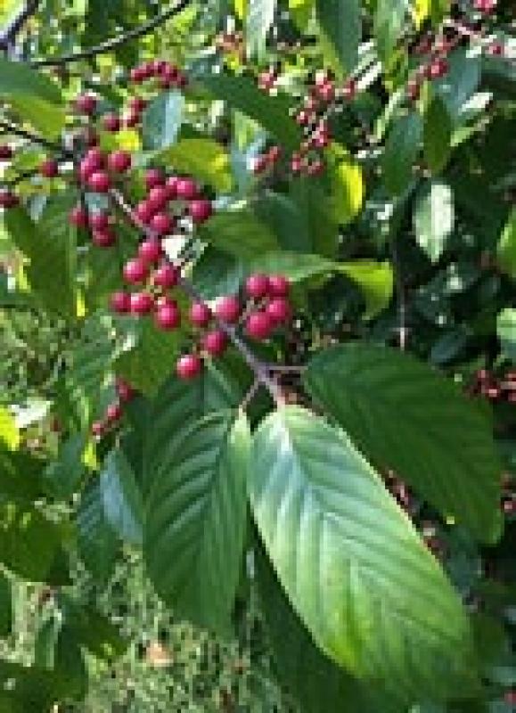 Carolina Buckthorn is a deciduous tree or shrub that is native to the eastern and central United States. It is commonly found in bottomlands, stream banks, and woods of the mountains in North Carolina. The plant can grow up to 20 feet tall with a spreading open crown. The flowers are insignificant in spring and are followed by a berry-like drupe in fall that is a favorite of wildlife. Carolina Buckthorn is easy to grow in average, moist, well-drained alkaline soils in full sun to partial shade. It can be used in naturalized areas to attract wildlife, as a hedge or for screening.