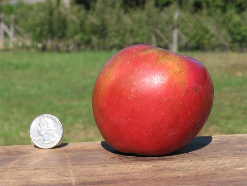 The apple is medium to large and very round- though it can be lopsided or lobed depending on where it grows in the tree. It has bright red, glossy skin with numerous lenticels that give the apple a polka-dotted appearance. The skin is rather thick and chewy further helping its resistance to disease- particularly to Apple Cedar Rust. Its flesh is yellow, medium grained (which means its juicy), and firm. More sweet than tart when eaten fresh but flavor peaks about 1 month into storage so the tartness has a chance to develop. Also an excellent baking apple.  It ripens in September and early October and stores well. Very disease resistant. (Patented)