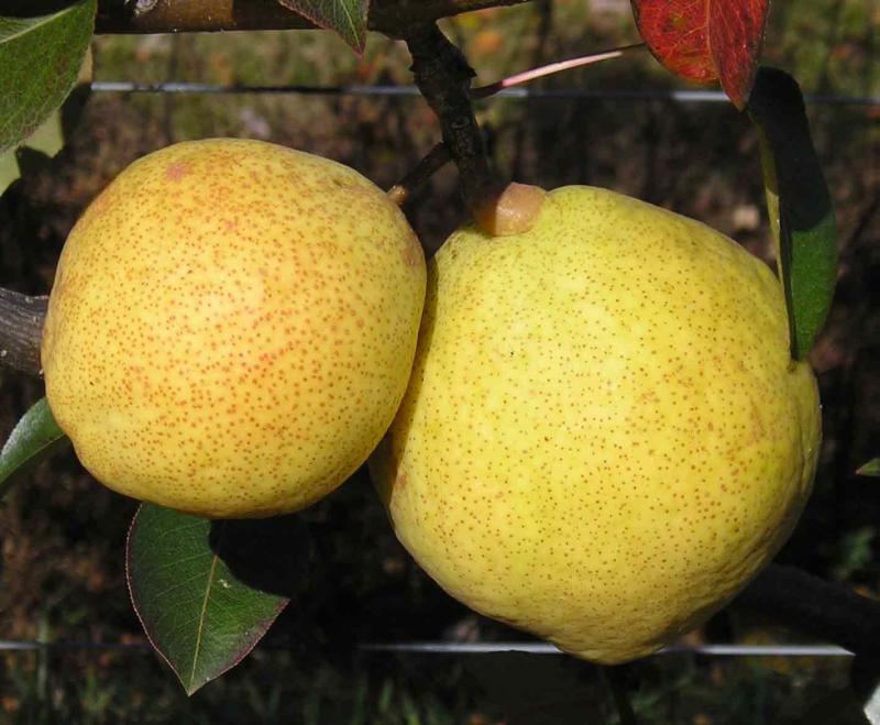 Kieffer is a well-known American pear variety introduced by Peter Kieffer of Philadelphia in the second half of the 19th century. It has an unusual ancestry, being probably a seedling of a Chinese pear (Pyrus prunifolia) crossed with the widely grown European pear (Pyrus communis) Barlett. Although, in most respects, it can be considered a European pear, the crisp, coarse flesh hints at Chinese ancestry.