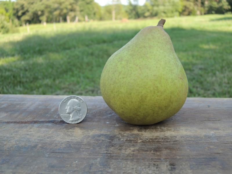 The Magness pear is a soft, juicy dessert pear that is almost free of grit cells. Introduced by the USDA in the 1960s, it was named in honor of Dr. John R. Magness, long-time director of the USDA's apple and pear breeding program. Its parents are Comice pear and Seckel pear.  The Magness pear tree produces medium to large, slightly russeted fruit, buttery, rich flesh with honeyed juice, ruddy yellow when ripe, and highly aromatic flesh of the best quality. Insect damage seems to be reduced in this variety due to thicker fruit skin. Magness pear is very disease resistant, especially fire blight. Sterile pollen so it requires a pollinator.