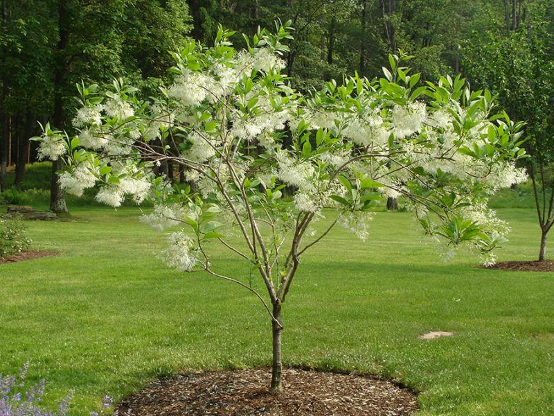 Chionanthus virginicus, commonly called fringetree, is a deciduous shrub or small tree with a spreading, rounded habit that typically grows 12-20' tall (to 35' in the wild, however) and most often occurs in rich, moist woods and hillsides, moist stream banks, limestone glade margins and rocky bluffs and ledges. Common name refers to the slightly fragrant, spring-blooming flowers which feature airy, terminal, drooping clusters (4-6" long) of fringe-like, creamy white petals. Dioecious (separate male and female plants), but also may have perfect flowers on each plant. Male flowers are showier than female flowers. Fertilized perfect or female flowers give way to clusters of olive-like fruits which ripen to a dark, bluish black in late summer and are a food source for birds and wildlife. Wide, spear-shaped leaves (to 8" long) turn yellow in autumn.