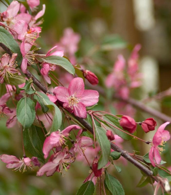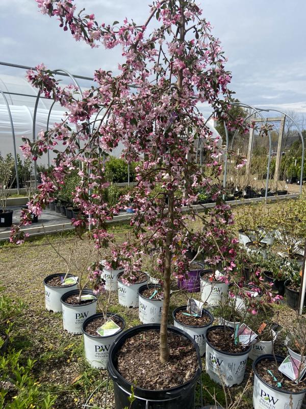 Ruby Tears™ Crabapple is a small ornamental tree that fits in any landscape. Each spring, red buds open to fragrant pink flowers that completely engulf the cascading branches. Attractive dark red fruit lasts into mid-winter, providing more seasonal interest. The naturally weeping branches add personality, structure, and texture to the landscape in addition to its beautiful blooms, fruit, and burgundy tinted leaves.