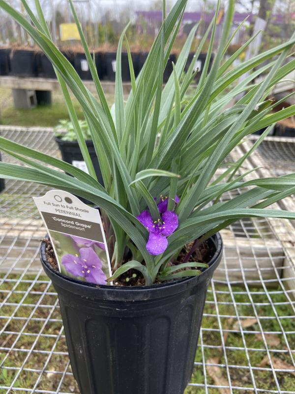 Concord Grape Spiderwort is a hybrid selection of spiderwort with beautiful narrow foliage in a unique steel-blue shade, forming a compact mound that is studded with a summer-long display of small, triangular flowers in a rich violet-purple shade. It is a perennial plant that grows in USDA zones 3-9.