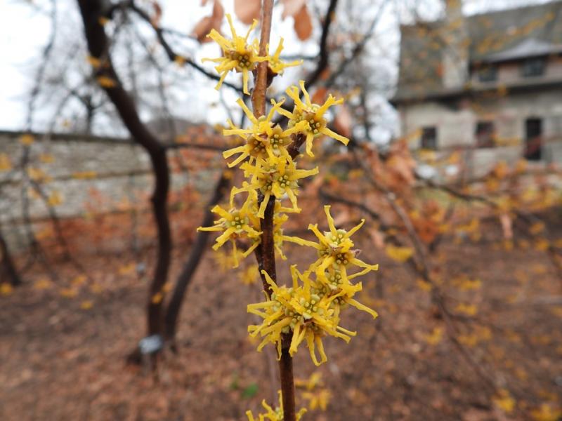 The vernal witch hazel, Hamamelis vernalis, is native to stream banks of the south-central portions of this country. It is the earliest shrub to flower in spring, and its small, yellow-red blooms can be prolonged in cold weather. At the Garden, it typically blooms from late February to early April, depending on the weather. It can form dense, multi-stemmed colonies along streams by sending out suckers. The medium green leaves turn a spectacular golden yellow in fall. It is more tolerant of higher pH soils than H. virginiana and grows well in poorly drained clay soils.
