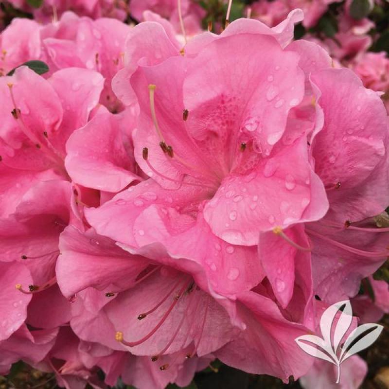 A reblooming Azalea with masses of large single pink flowers in spring, some sporadic summer flowers, and then masses of late summer and fall flowers.