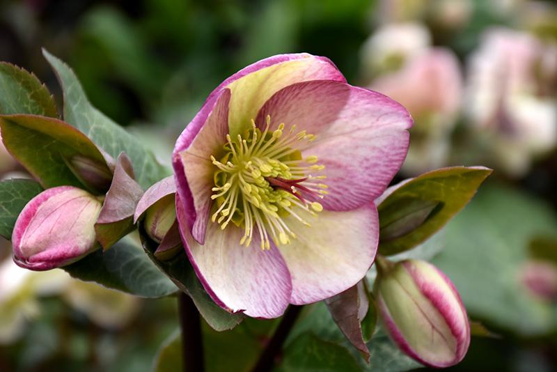Not only does this Lenten rose fill late winter with blossoms, but the generous crop of white flowers hemmed in violet-pink is held proudly above the tidy mounds of shiny leaves for a 2-3 month performance. 'EPB 25' PP 28,008