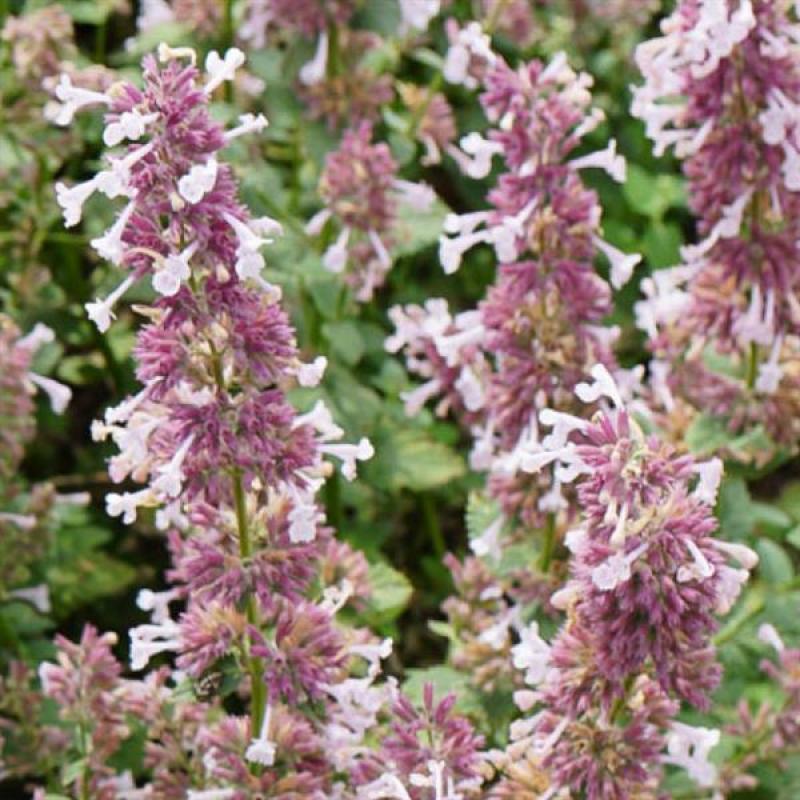 'Whispurrâ„¢ Pink' Nepeta is an extremely robust cultivar with extra-large flower clusters. The 1-2-inch-wide plumes are larger than most Nepeta, formed by a collection of soft pink flowers that open in mid-spring. The mounds of foliage give off a wonderful minty fragrance, making them a deer-resistant delight along walkways, or stone walls where they can drape over the edge.