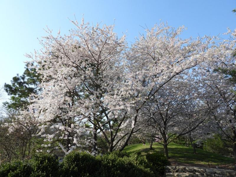 Prunus × yedoensis, commonly called Yoshino cherry, is a graceful ornamental flowering cherry tree that typically grows 30-40’ tall with a spreading, broad-rounded, open crown. Fragrant white (sometimes tinged pink) flowers in 3 to 6-flowered clusters (racemes) appear before or simultaneous to the emergence of the foliage in a profuse and spectacular early spring bloom. Flowers are followed by small black cherries (1/2” diameter) which are bitter to humans but loved by birds. Serrate, dark green leaves (to 5” long) are elliptic to oval. Foliage turns yellow and with bronze tints in fall. This hybrid cherry comes from Japan and is one of the predominant cherry trees planted in Washington D.C.