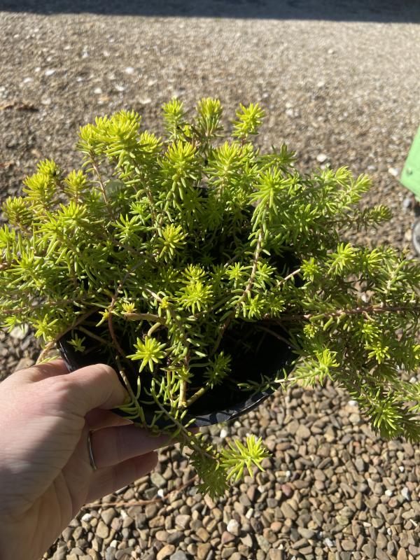 Sedum rupestry 'Angelina' is a cultivar of the Sedum species rupestry and is mainly grown for its striking spiky yellow leaves that turn an attractive red-orange color with cold weather in the fall. In the wild, this plant is often found along walls, shingle and warm grassy places on sandy soils. It avoids acid soils. Plant in the full sun, although it tolerates light shade, and in a site that provides good drainage. Gardeners often use the plant as a groundcover in a rock garden, draping over a rock wall, or hanging basket. It is a mat-forming plant that spreads rapidly. It looks best in small groups or mass planted as a border front or lining a walkway or patio.  This plant is resistant to damage by deer and rabbits and tolerates drought, air pollution, and dry rocky soils.