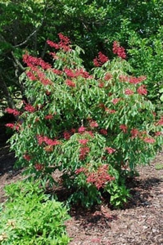 Red buckeye, also known as Aesculus pavia, is a deciduous shrub or small tree that grows up to 15 feet tall and is native to North America. It blooms in spring with showy, erect, 4-10” long panicles of red to orange-red, narrow-tubular flowers. The leaves are palmately compound, shiny, dark green, and attractive in spring and early summer, but usually begin to decline by August. The smooth, light brown, globular seed capsules encase 1-3 shiny seeds called buckeyes that ripen in the fall. Red buckeye is planted for the showy, red spring flowers and is best used as a specimen or in shrub borders.