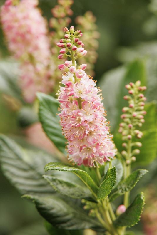 Fragrant spikes of small rich rose-pink flowers stand above glossy green foliage in the summer. Compact habit makes this a good choice for small gardens in shrub borders and mixed into perennial borders. Deciduous.