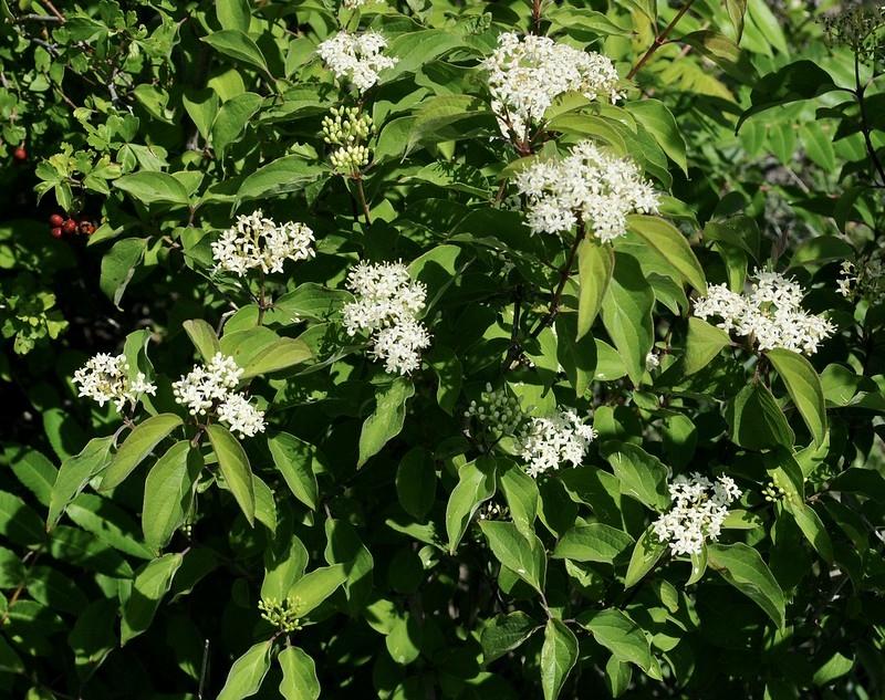 Roughleaf dogwood is a large, deciduous shrub or small tree in the dogwood family (Cornaceae) usually growing up to 16 feet tall and 16 feet wide. It is native to central North America. Its habitats include rocky woodlands, floodplain woodlands, moist prairies and thickets. Because this plant grows so quickly and suckers, it may be best used in naturalized areas versus a lawn or garden setting. It may also help stabilize banks and provide erosion control. The roughleaf dogwood will attract much wildlife as a source of food and shelter and add interest to a naturalized area. It forms a dense thicket and has been used as an informal hedge, border or screen.