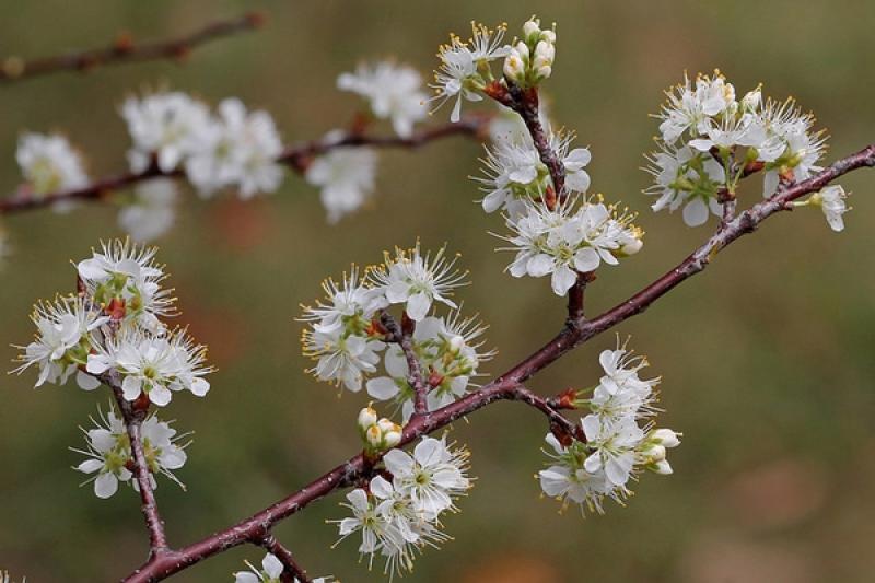 Prunus angustifolia, commonly called Chickasaw plum, is a deciduous native multi-stemmed shrub or small tree which occurs in thickets, pastures, fields, fencerows, and stream banks. Most often seen in the wild as a 4-10' tall, thicket-forming shrub which freely suckers to form large colonies. Infrequently seen as a small short-trunked tree growing to 25' tall. 2-4 flowered clusters (umbels) of 5-petaled white flowers (1/2" diameter) appear along the stems in March before the foliage emerges. Flowers are followed by small, cherry-like, edible, red to yellow plums (to 1/2" diameter) which ripen in early to mid summer. Although the plums may be eaten raw, they are somewhat tart and acidic, and are perhaps best used in preserves and jellies. Toothed, narrow, oval-lanceolate, bright green leaves (1-3" long). Branches and twigs are an attractive reddish-brown and sometimes have thorny lateral branchlets. Native Americans regularly consumed the fruit fresh or dried it for winter.
