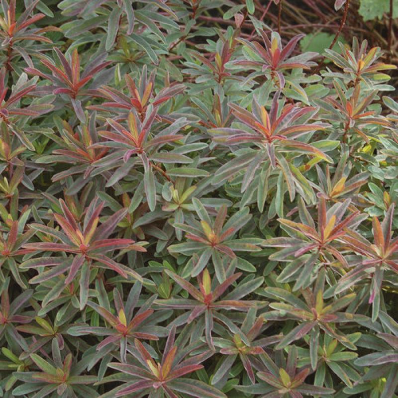Bonfire Cushion Spurge is a perennial plant that grows low to the ground and has colorful foliage. The leaves of this plant change color from green to burgundy red in the summer and turn rich red in the fall. It is a heat-tolerant, drought-tolerant, and salt-tolerant plant that is resistant to deer and rabbits. The plant grows up to 10 inches tall and spreads up to 18 inches wide. It is a great choice for beds, walkways, and patios. In late spring, the plant produces crackling sulfur yellow bracts that light up the whole plant for several weeks.