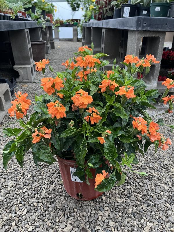 A lovely tropical plant with beautiful, mounded, shiny deep green leaves; orange flowers with yellow eyes rise above on spikes in summer; does not tolerate cold weather, so take indoors for winter