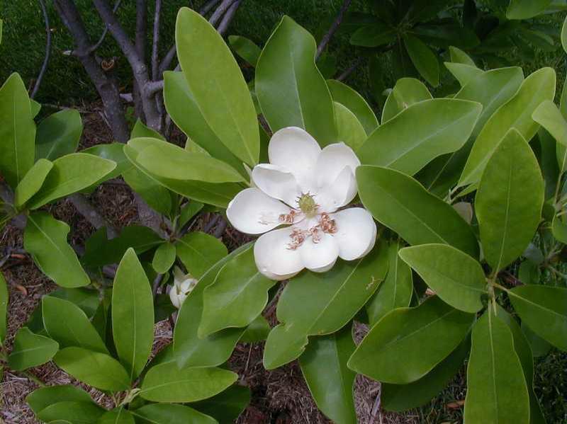Jim Wilson’, commonly sold as MOONGLOW, is a patented cultivar that is distinguished from the species by (1) more vigorous upright growth, (2) better cold hardiness with semi-evergreen foliage in the northern part of its range, and (3) slightly larger flowers. This is a medium-sized tree with an oval to vase-shaped form. It typically grows over time to 35’ tall with a spread of 18’. Cup-shaped, sweetly fragrant (lemony), 9-12 petaled, creamy white, waxy flowers (2-3” diameter) appear in mid-spring (May-June) for about one month and sometimes continue sporadically in the summer. Semi-evergreen elliptic to lanceolate leaves are glossy dark green above and silvery-green below. Cone-like fruits with bright red seeds mature in fall and can be showy. U.S. Plant Patent PP12,065 was issued on August 28, 2001.