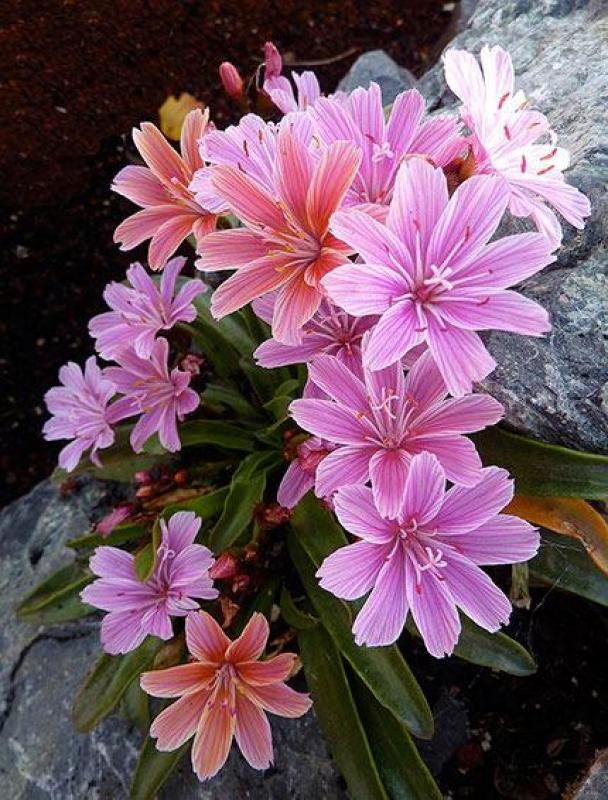 'Little Plum' lewisia (Lewisia longipetala) is a native perennial often used to add a splash of vibrant color to rock gardens. Its gorgeous tropical pink flowers and glossy green foliage are marvelous to look at, and we love seeing this pretty perennial paired with other drought-tolerant perennials in a sunny window box.