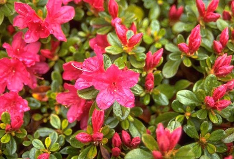 Hinodegiri Evergreen Azalea, Azalea kurume x 'Hino-Degiri', grows well in zones 5 through 8, so it is cold hardy. It also can produce its mass of flowers despite favoring partly shady conditions. At about 3 to 4 feet high and wide once it reaches full size, HinoDegiri is small enough to feature in a large container or as a special focus of a garden bed or border. It's also a pretty choice for Asian garden designs or woodland landscapes. The deep red flowers cover the shrub at peak bloom, making a nice contrast against conifers or other foliage.