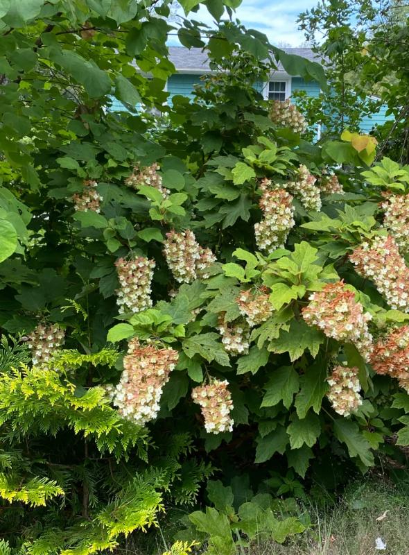 Oakleaf Hydrangea shrubs, such as this unique Snowcicle Hydrangea, make quite a scene in the landscape. Whether a single shrub or a group, the snowcicle oakleaf hydrangea makes a wonderful flower-filled display with its thick clusters of white florets from large panicles that cover the 4-6' shrub all summer long. The florets on this oakleaf hydrangea age from their white to soft rose-red, then change to a light green hue as the season goes on. At times, your landscape will be awash in all three colors at once. Works well as a specimen planting to anchor a flower bed or cutting garden. Plant three or more of these snowcicle oakleaf bushes as a hedge or screen to create small, private areas perfect for al fresco dining or simply enjoying the view. Dry flower heads for interesting indoor arrangements. Hydrangea quercifolia 'Snowcicle' PP33072