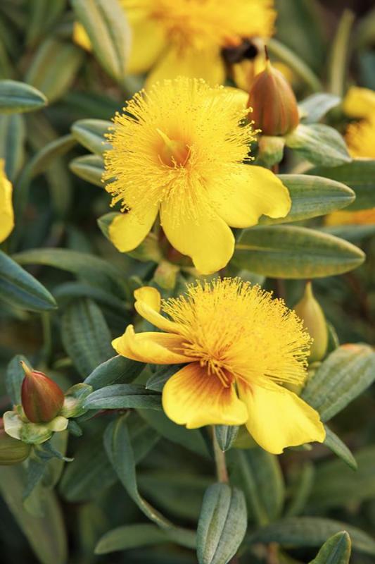 Dense, blue-tinged, green foliage on a compact, upright shrub that is excellent as a foundation plant, in mass plantings, and informal hedges. Vivid yellow flowers with a distinctive puffball of stamens add sunny color to the summer landscape. Seldom grazed by rabbits or deer. Deciduous in colder regions; an evergreen in warmer climates.