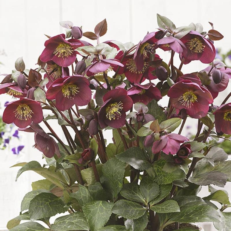 Rosy red flowers fade to burgundy red on this deer-resistant, compact plant. Leafy flower stems are held upright on lush marbled foliage. Perfect for a shady border, container, or as a potted holiday gift. Evergreen.