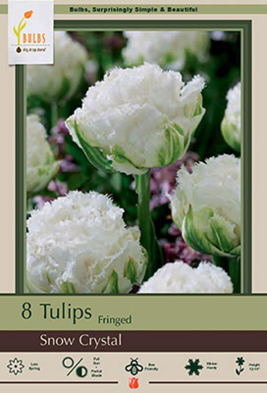 A truly unique fringed tulip, ‘Snow Crystal’ bears pure white, peony-like blooms edged with heavily fringed, almost ruffled petals that resemble frost. Blooming in mid- to late spring, the sturdy stems and long-lasting flowers make it ideal for borders, containers, and elegant cut arrangements. Its sparkling texture and crisp white color add a touch of sophistication and drama to the spring garden.