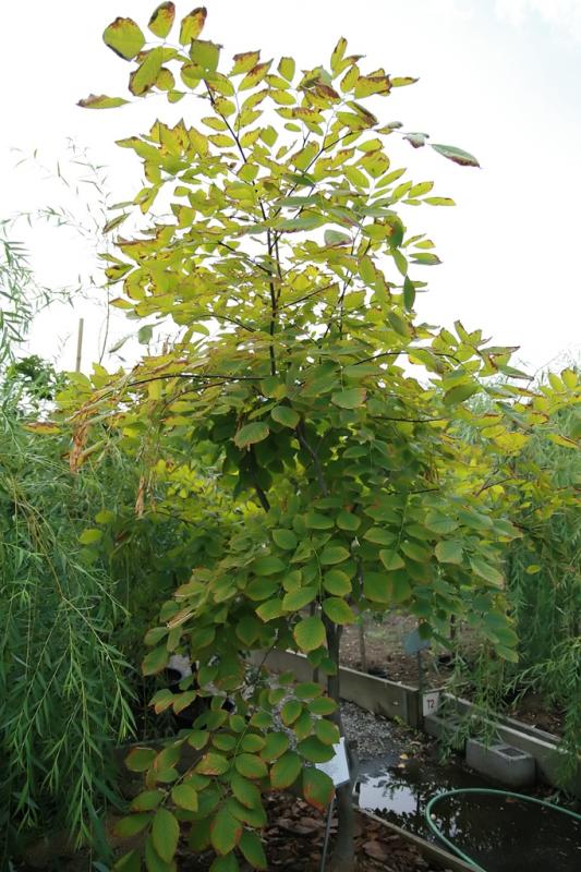 Cladrastis kentukea, commonly called American yellowwood, is a medium-sized, deciduous tree of the legume family that typically grows 30-50’ tall with upright branching and a broad, rounded crown. It is noted for its pinnately compound foliage, panicles of fragrant white spring flowers, autumn seed pods and yellow fall color. The species is native to the southeastern U.S.