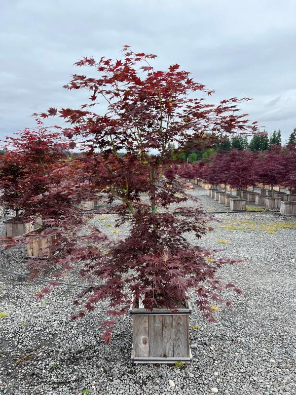 The deep red-black, dark chocolate colored foliage of Acer palmatum ‘Tsukushi gata’ holds its surprising color all summer, when the star-shaped leaves change to scarlet before they drop. A rare form of Japanese Maple, it produces green seed set as well as green venation and bark, all of which contribute to a dramatic color contrast.