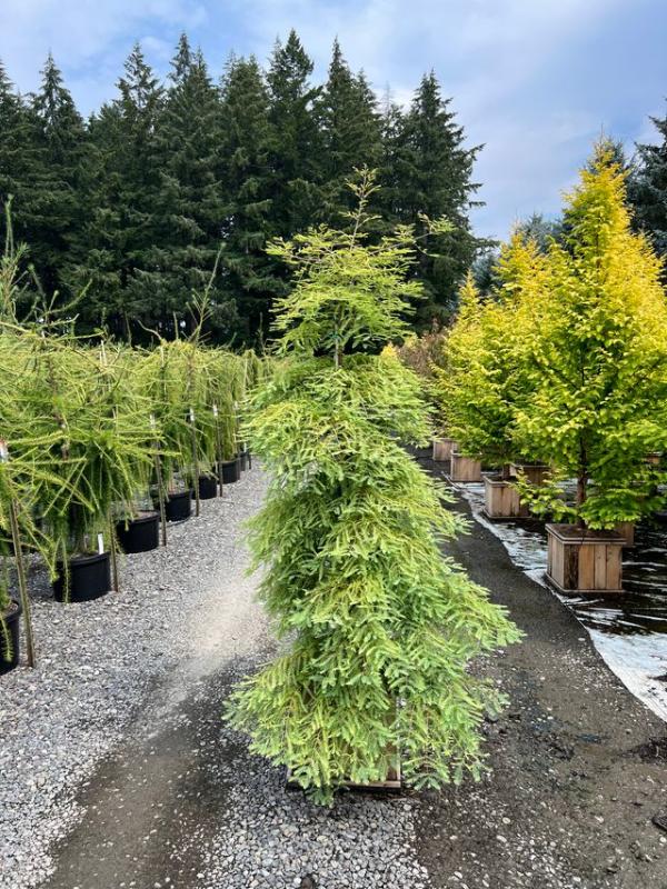 Metasequoia glyptostroboides ‘Miss Grace’ is the first Metasequoia cultivar with strongly weeping branches. This gorgeous plant makes a superb living sculpture when it is staked up so the branches drape freely. The tree’s small needles and thin branches resemble those of the species Taxodium, but with opposite, not alternate, buds and needles. When the deciduous conifer drops its foliage, the peeling bark and swooping framework supply winter interest. Discovered as a witch’s broom in New York, it was introduced by Buchholz & Buchholz Nursery, in Gaston, Oregon