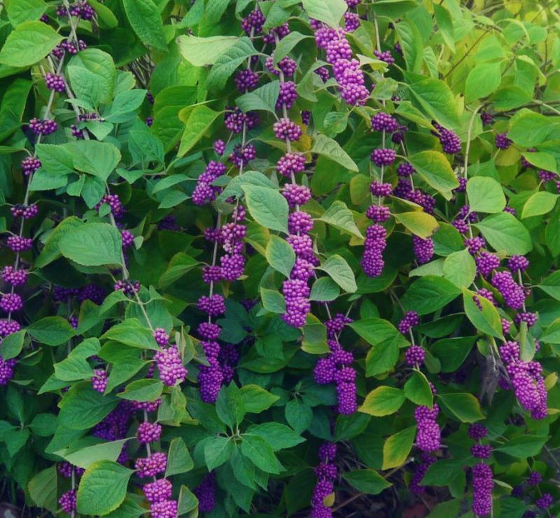 The American beautyberry is a deciduous shrub that belongs to the mint family. It is native to the central and southeastern United States, Bermuda, and Cuba. The shrub produces showy purple fruits in the fall that are arranged in clusters along the stems and in the axils of the leaves. The fruits are a good food source for songbirds and small mammals. The shrub prefers full sun to part shade and is intolerant of deep shade. It will grow in all types of soil provided there is good drainage. Pruning is best done in late winter. Prune low and avoid fertilizer to reduce height and fruit set. It is recommended that old canes be removed for rejuvenation of the shrub because the flowers and fruits appear on new shoots. The leaves, when crushed, produce a chemical that can repel mosquitos, ticks, and fire ants. This shrub is suited for mass plantings, large landscapes, naturalized areas, pond margins and container gardening. They seem to produce more fruit if several more of the same type of shrubs are planted nearby.